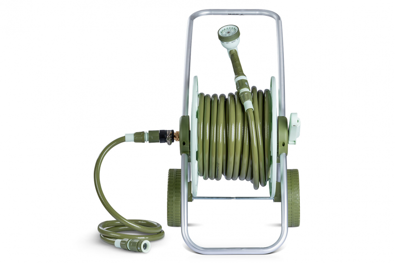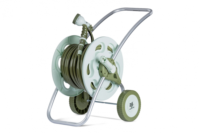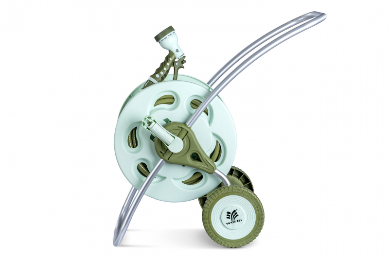 التصميم: عبارة عن عربة بكرة خرطوم متحركة (Hose Reel Cart) مزودة بعجلتين ومقبض، لسهولة النقل والمناورة.