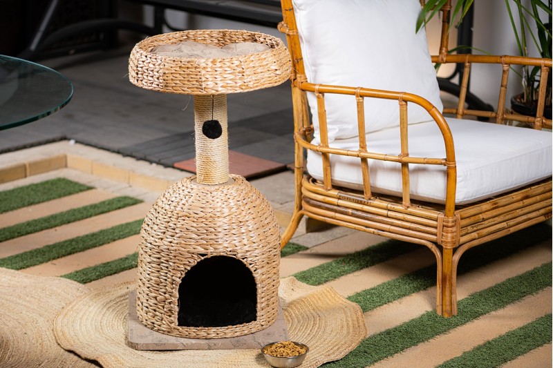 أثاث قطط منسوج جميل يتميز بملاذ للاسترخاء وجرس وكرة للعب