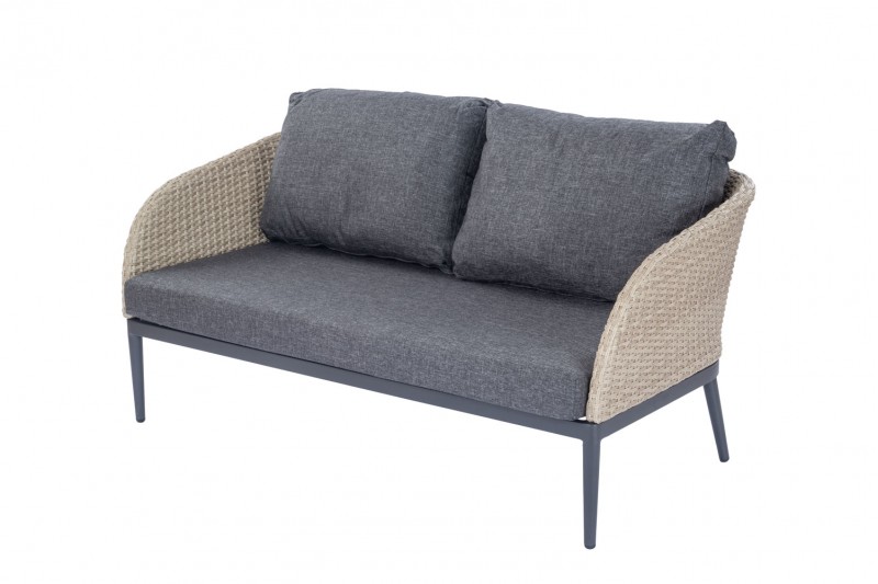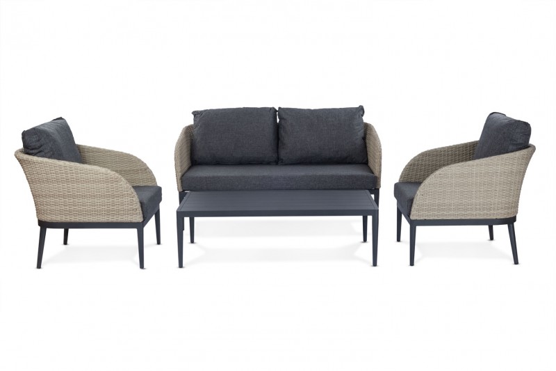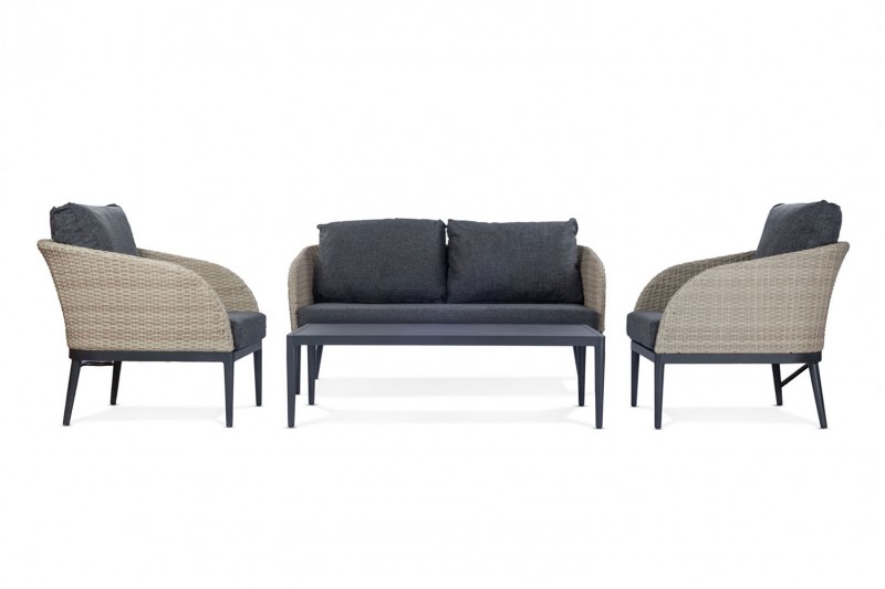 طقم جلوس خارجي يحتوي على مقعد يتسع لشخصين، وكرسيين مفردين، وطاولة وسط.