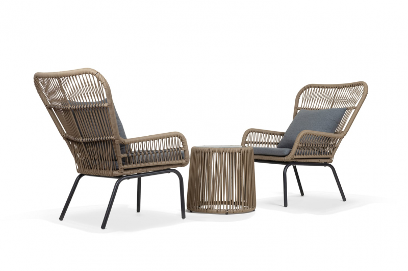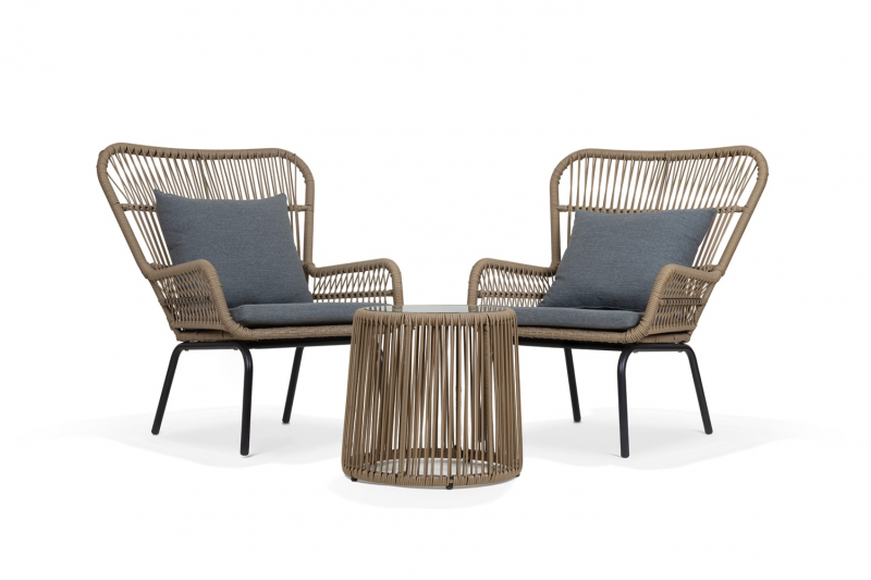 تتكون هذه المجموعة الأنيقة من قطعتين من كراسي الراتان المريحة وطاولة جانبية متناسقة، مما يخلق مساحة مثالية للأسترخاء في الهواء الطلق.