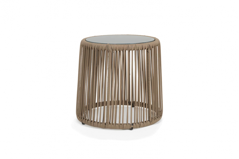 سطح طاولة زجاجي دائري يوفر مساحة مستوية للمشروبات أو الوجبات الخفيفة.
