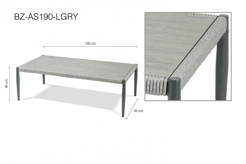 طاولة القهوة: سطحها العلوي مزود بقطعة سيراميك تضفي لمسة من الرقي وتسهل التنظيف. وتتميز بطبقة واحدة فقط من الخوص الملفوف حول الأنبوب العلوي للطاولة لإضفاء لمسة جمالية متكاملة.