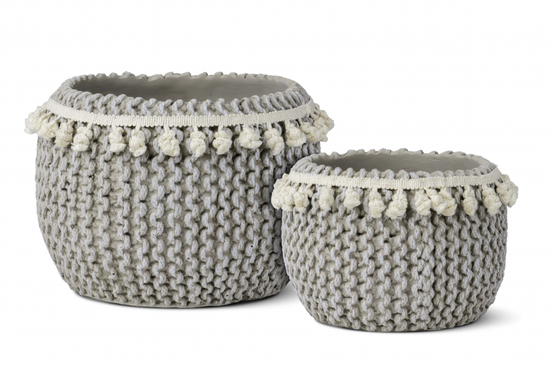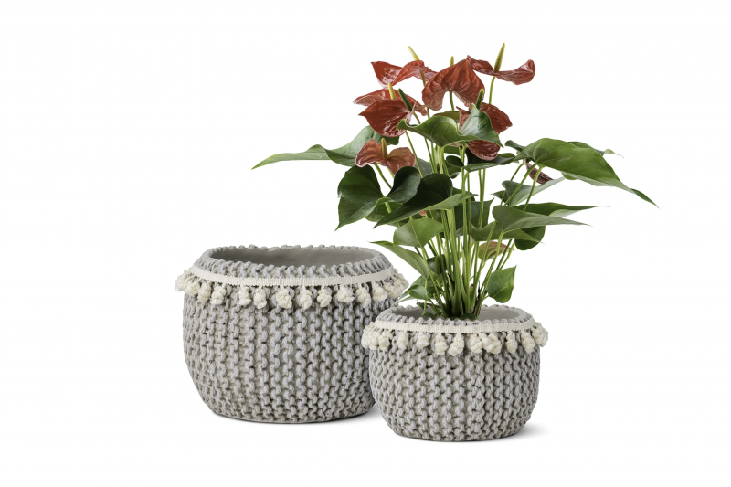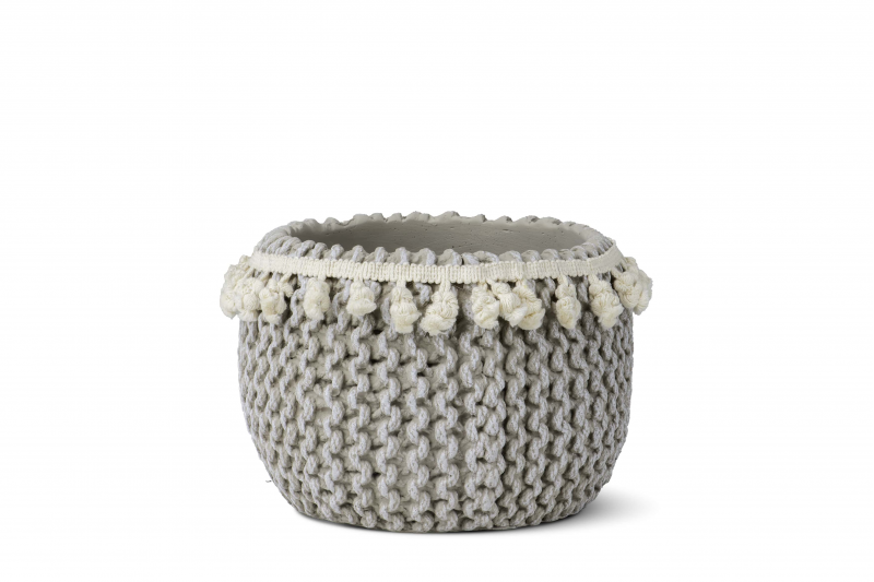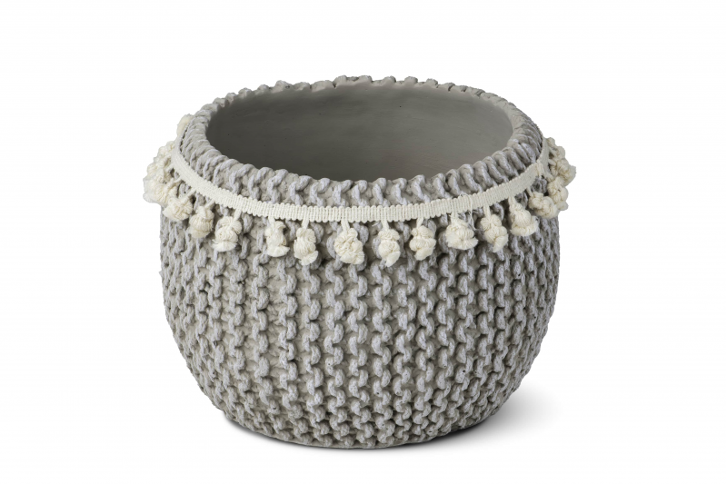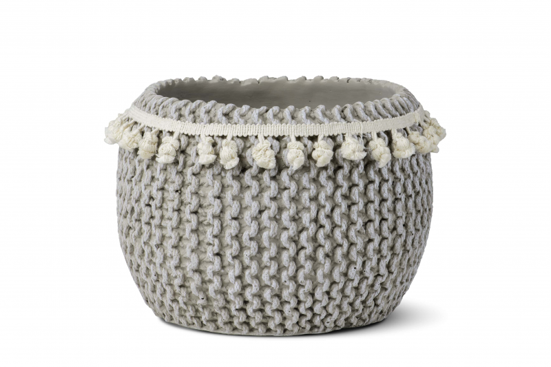 حوض نباتات مصنوع من الأسمنت، بتصميم منسوج أو معقود بشكل زخرفي يشبه الدانتيل أو الكشكشة