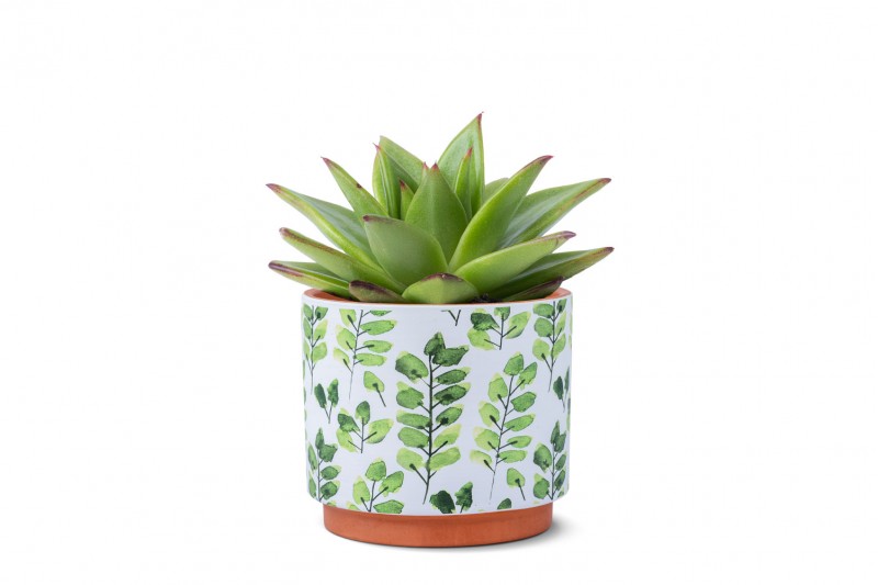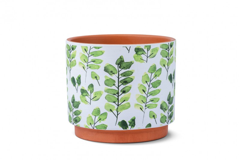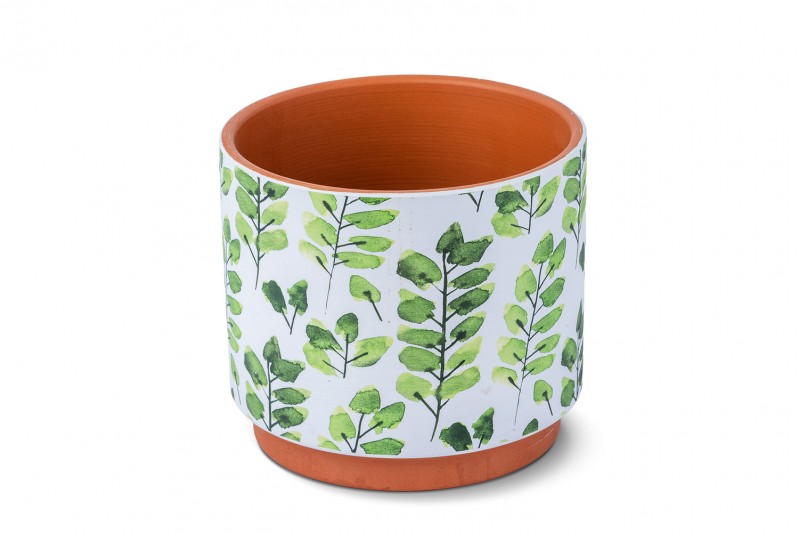 التصميم الخارجي: نمط متكرر لأوراق شجر بألوان الأخضر المتدرج (فاتح وداكن) على خلفية بيضاء. الأوراق مرسومة بأسلوب يشبه الألوان المائية أو الفرشاة