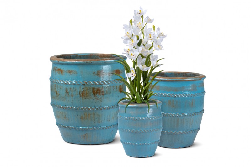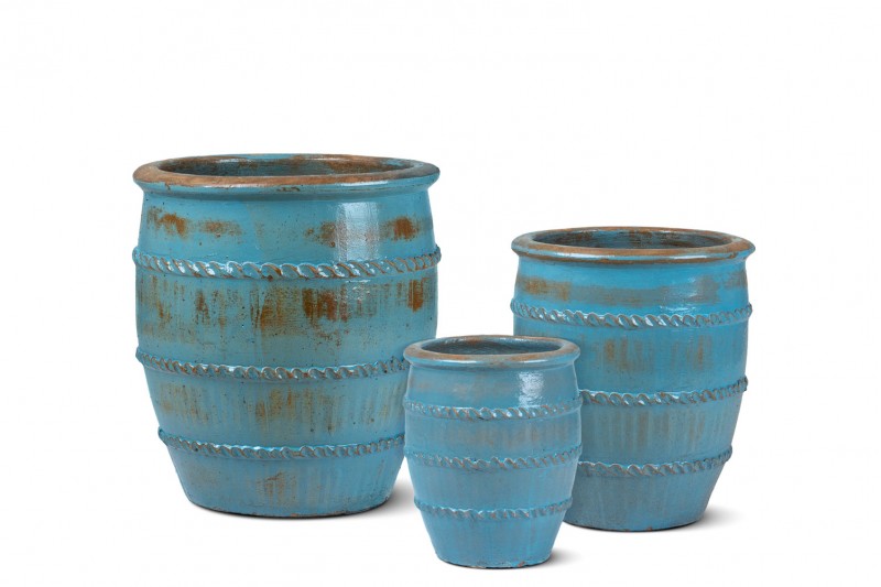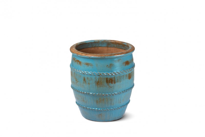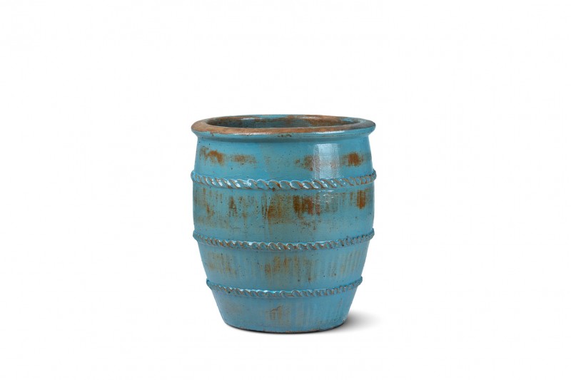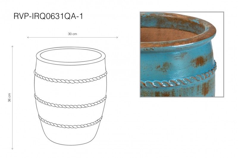 اللون: درجات من الأزرق الفيروزي، مع بقع وتأثيرات بنية/صدئة تضفي عليه مظهراً عتيقاً أو ريفياً.