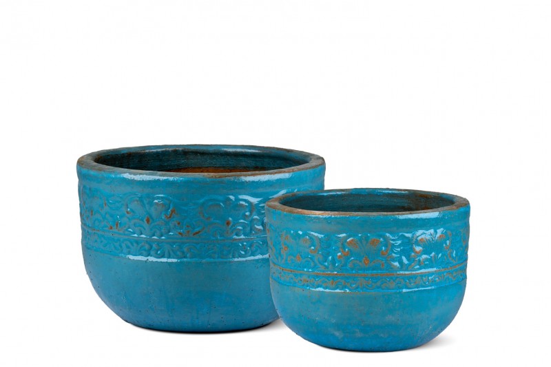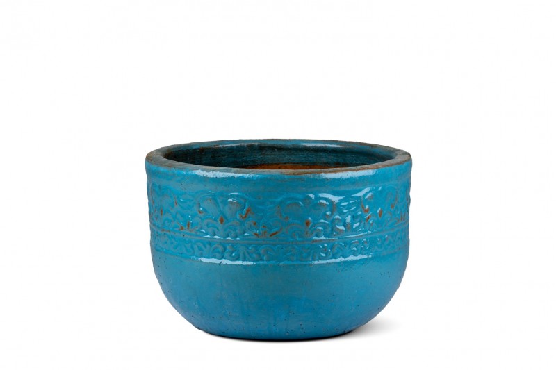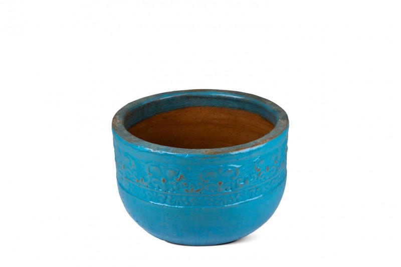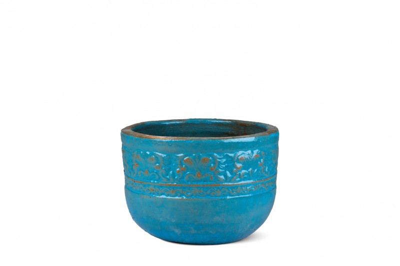 اللون: درجات من الأزرق الفيروزي أو الأزرق المائي اللامع، مع تأثيرات بنية/صدئة تظهر من تحت الطبقة الزرقاء، مما يمنحه مظهراً عتيقاً أو مطفأً.