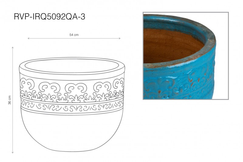 يتميز الجزء العلوي من الوعاء بشريط زخرفي بارز يحتوي على نقوش متعرجة أو حلزونية، مع تفاصيل صغيرة.