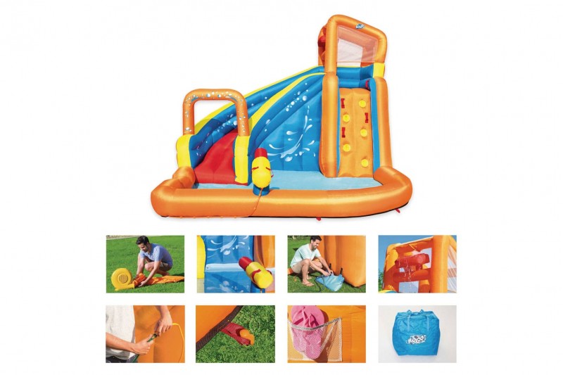 1 حديقة مائية، 1 منفاخ، 1 خرطوم رش الماء، 1 حقيبة تثبيت، 1 طقم إصلاح، 1 حقيبة تخزين، 8 أوتاد نطاطة. حائط للتسلق مع 3 مقابض و 5 درجات أقدام