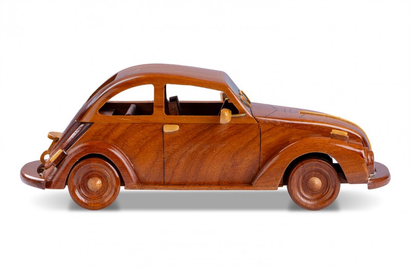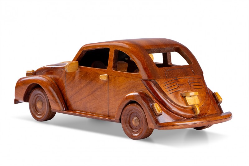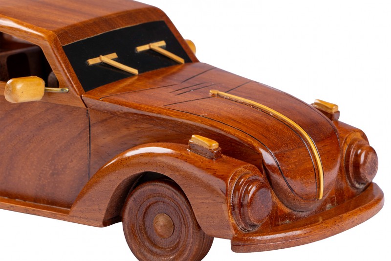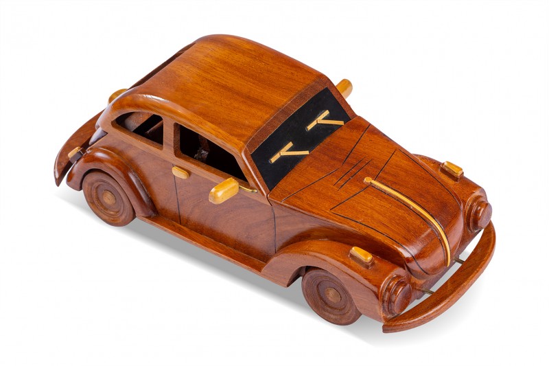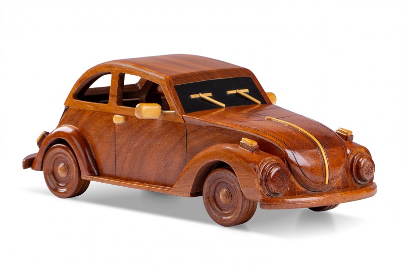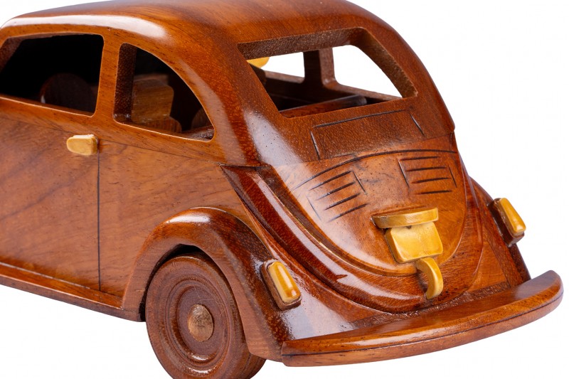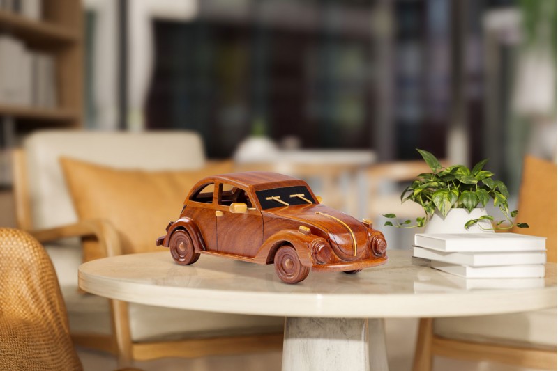 هذا النموذج المصغر هو ماكيت لسيارة فولكس فاجن بيتل الكلاسيكية، وهو قطعة فريدة مصنوعة بالكامل من الخشب الطبيعي