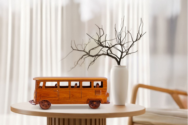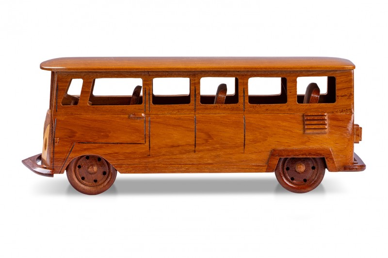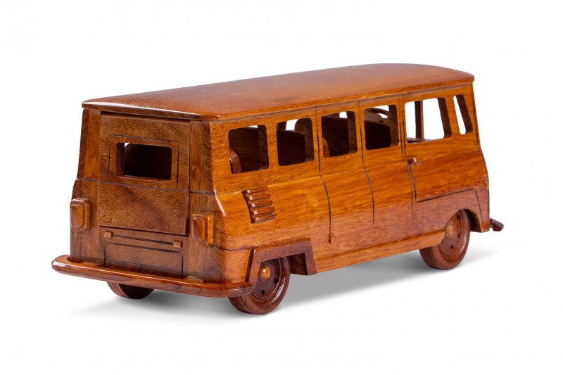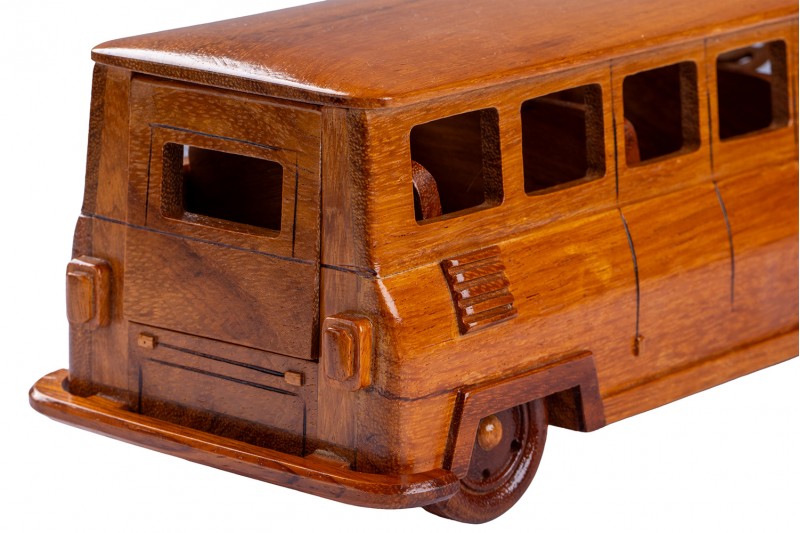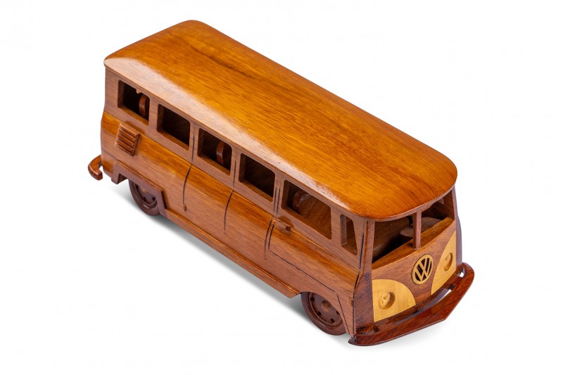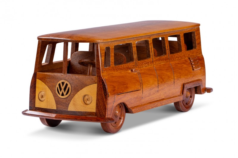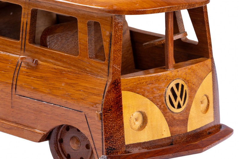 هذا النموذج المصغر هو ماكيت لسيارة فولكس فاجن ميني باص الكلاسيكية، قطعة فريدة مصنوعة بالكامل من الخشب الطبيعي