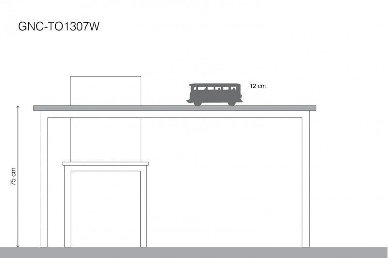المميزات: العجلات خشبية وقابلة للدوران، كما يضم تفاصيل دقيقة للمقاعد والنوافذ الداخلية.