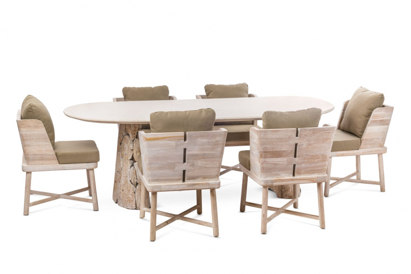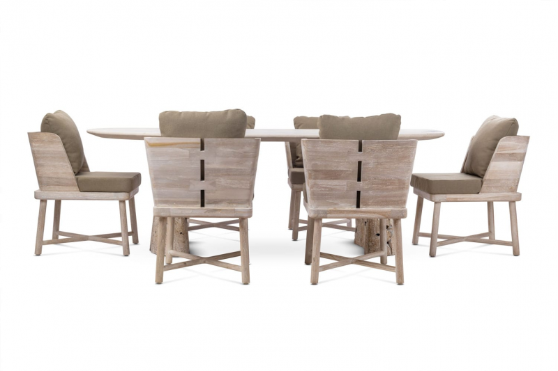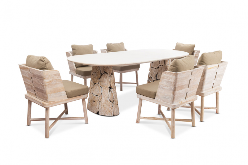 طقم طاولة طعام يجمع بين جمال وقوة خشب الساج الريفي ولمسة عصرية أنيقة من سطح الراتنج.