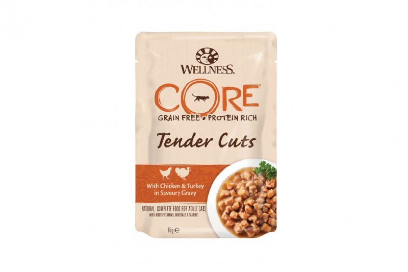 وصفات ويلنس كور عبارة عن قطع طرية طبيعية من الدواجن أو المأكولات البحرية خالية من الحبوب، مع الخضار والفواكه الصحية بما في ذلك الجزر والبطاطا الحلوة