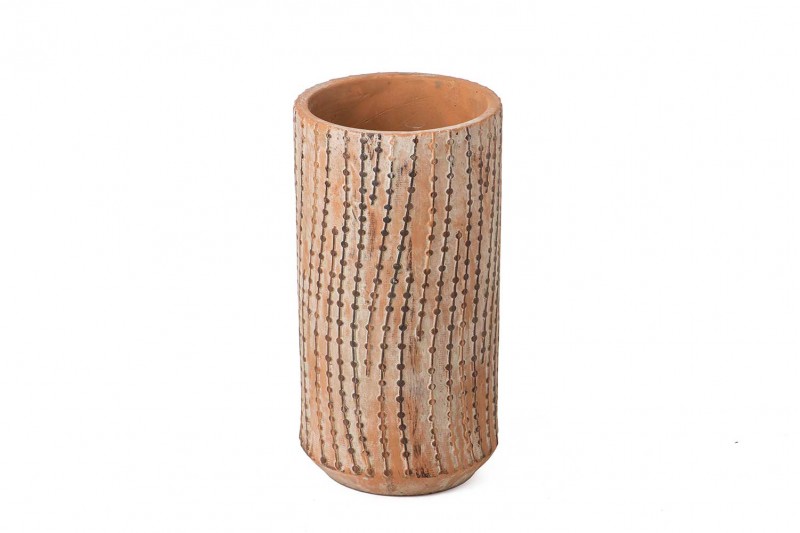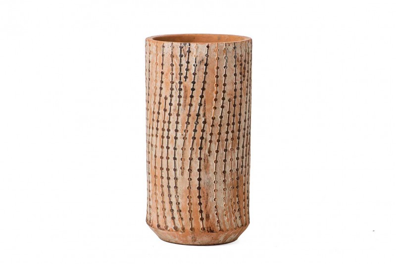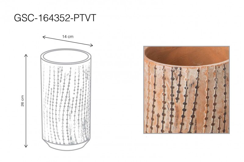 . الوصف: فازة سيراميك لون بني منقوش بتصميم فخاري