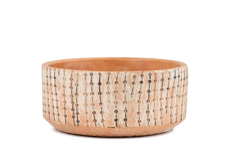 . الوصف: صحن سيراميك دائري لون بني منقوش بتصميم فخاري