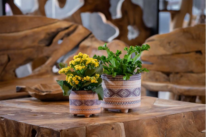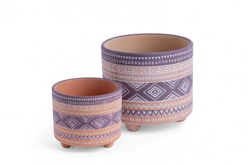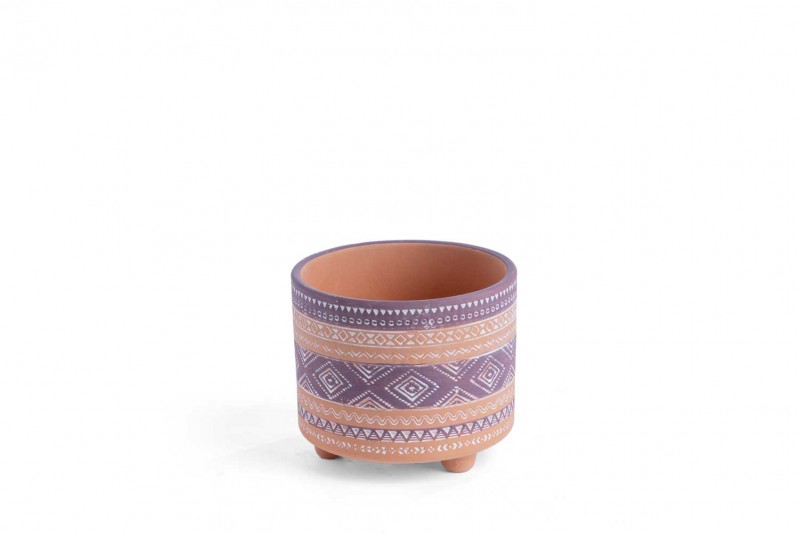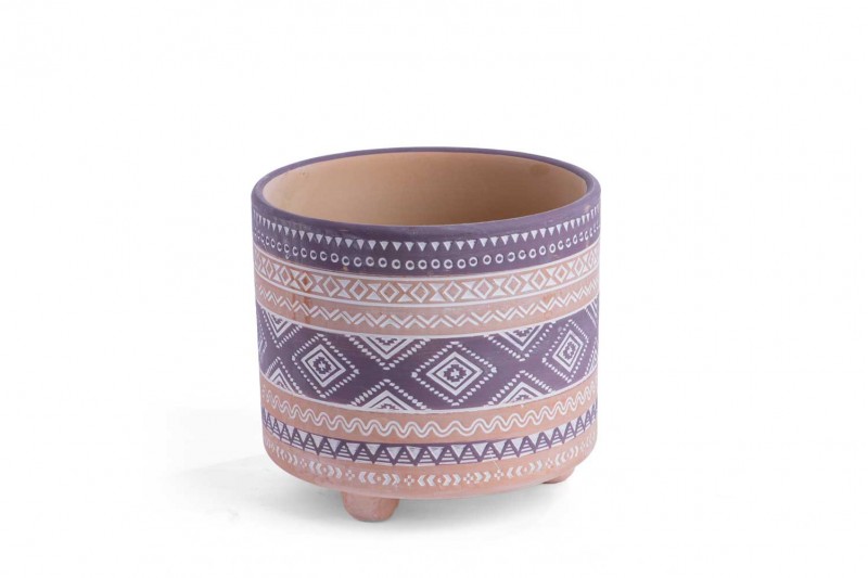 حوض من مادة الطين مزخرف صناعة يدوية لون بني وبنفسجي