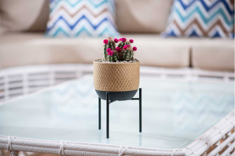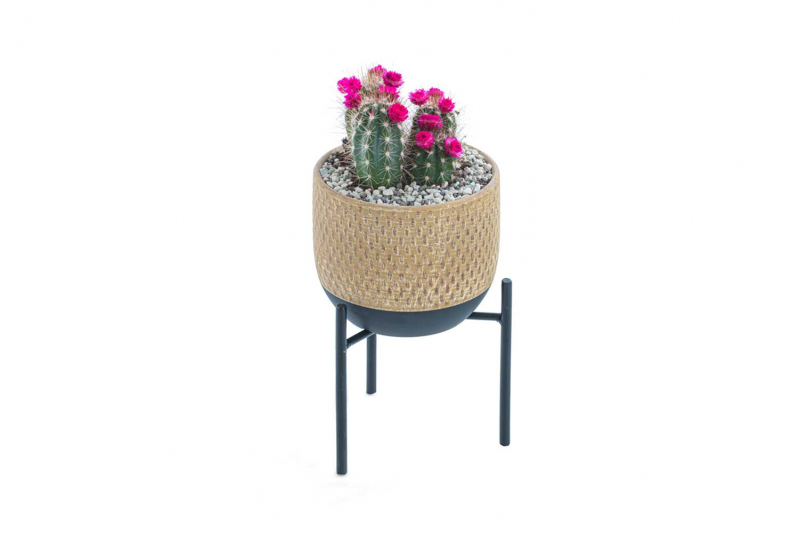 المركن: مركن من الطين مزخرف باللون الاسود والبني مع قاعدة معدنية لون أسود