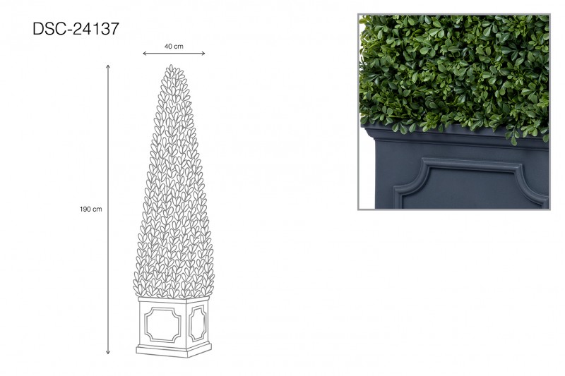 التصميم: تتميز بشكلها الهرمي (الشبيه بالهرم) الطويل والمدبب، مع مظهر أخضر كثيف. موضوعة في حوض مربع أنيق مزين بلوحات زخرفية بسيطة.