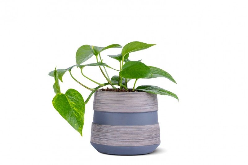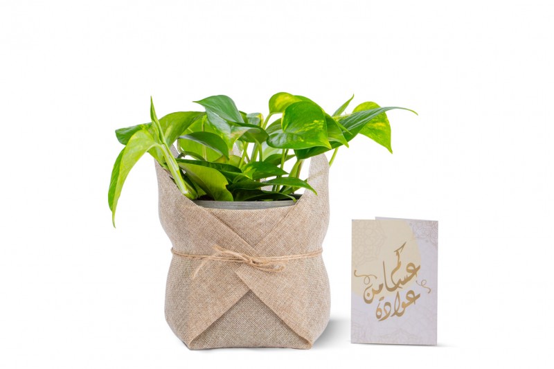 نبتة البوتس مزروعة في حوض من مادة الطين بتغليف أنيق مزين مع بطاقة معايدة